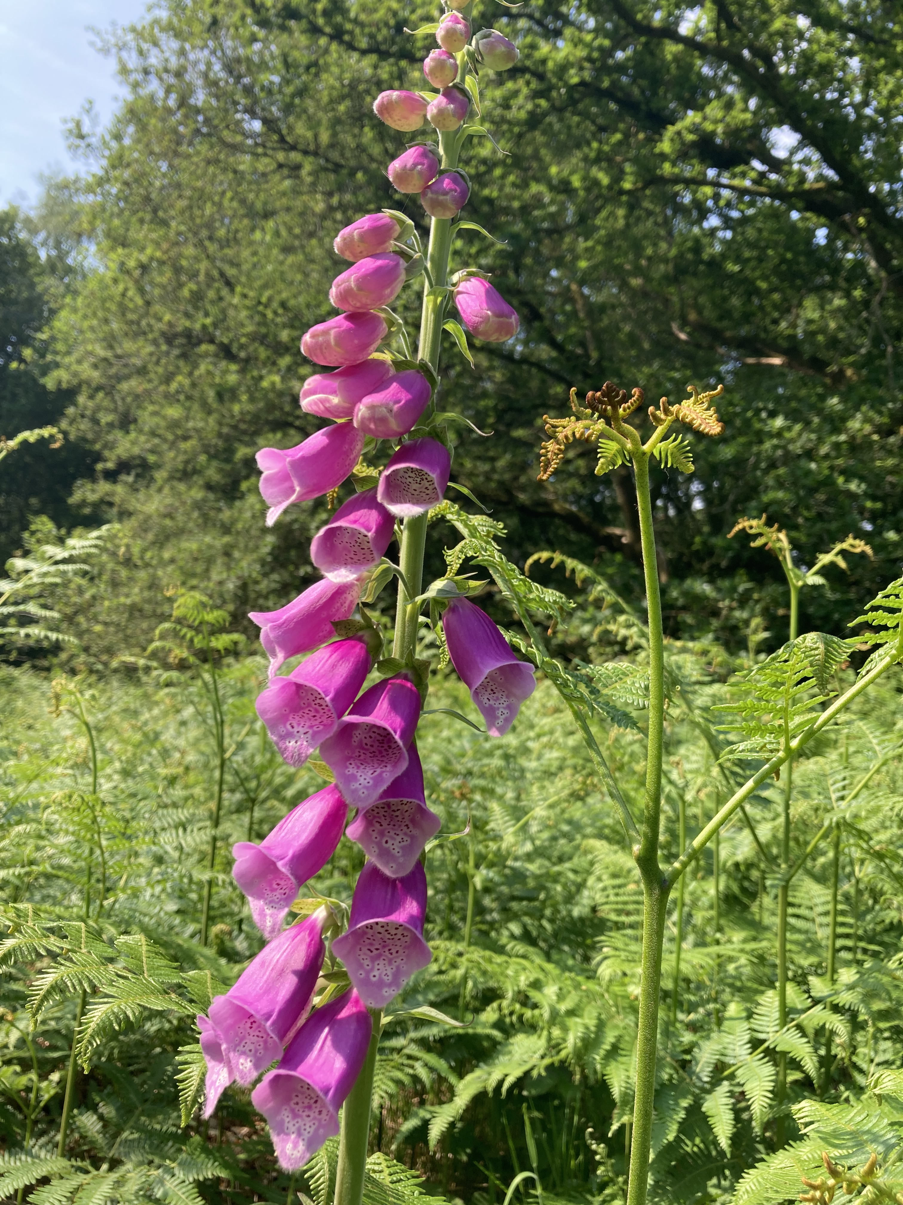 Leaving the gloom a clearing appeared and a flash of pink caught our eyes. A foxglove stretching up over the ferns called the bees to come and play. Its spotted pathway guided the bees to land. As their wings retracted their feet guided into the heady depths of each flower through dark doorways. Backing out, a small deposit of pollen braced itself and clung on as it was lifted up out of the glade, ready to meet and connect with flowers far afield.