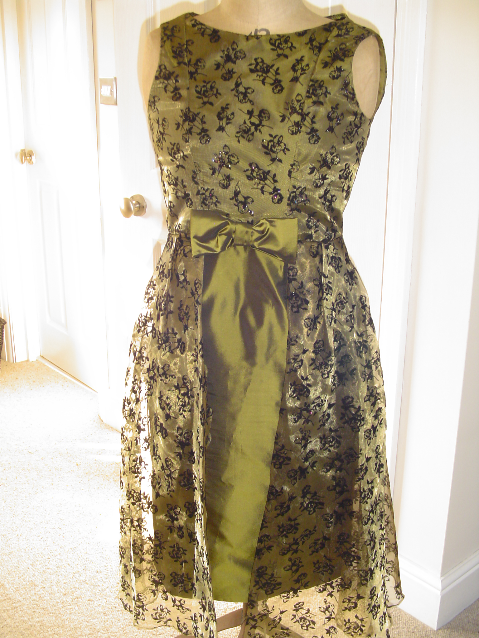 Had a fitting today after doing some more work on my beautiful dress over the weekend.   I decided to take off the sleeves as the weather may be quite warm, especially as this will have its first outing in May.  Without sleeves, my lovely mother had to adjust the back as I gained half an inch without the sleeves.  She helped me place the chiffon overskirt and then I tacked the blouse to the skirt.  At the fitting today, she levelled the hem, I am keeping it quite long just below my knee with chiffon about two inches longer.  We decided it needed something at the waist, first we thought of a black thick velvet ribbon but have decided on a flat taffeta bow in the olive.  This will add the detail it needs but keep the colour lighter.  I have decided against wearing the chain I posted about earlier, but will wear no jewellery except perhaps for a pair of earring.