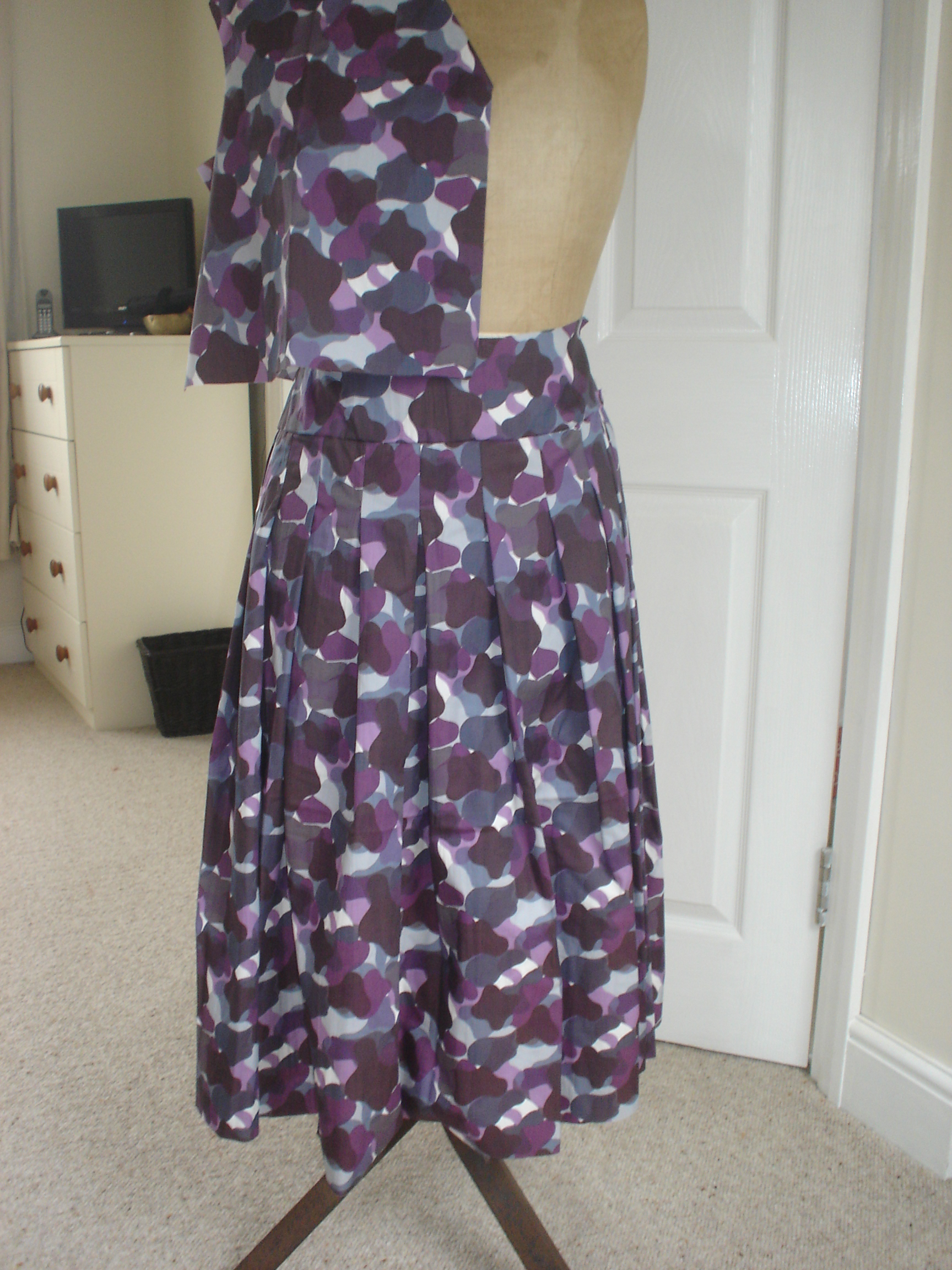 I got the material from the fab Jersey Vogue in North London.  The print is a camouflage print in mauve and purples and the material is similar to a cotton sateen.    I decided to copy one of my favourite skirts which has small box pleats all around and to add a sleeveless blouse top.  So far I have cut out all the pieces and stitched down the pleats on the skirt.  I am setting myself a deadline of the first weekend in June to finish this dress.    I am keeping to the fifties feel this dress – as I did with my Olive Taffeta dress.  I love the styles from this decade and the early Sixties.